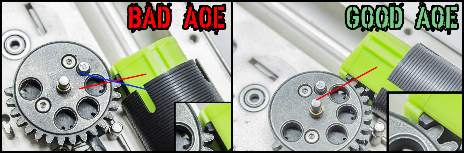 Mám trochu pocit, že tu pleteme pojmy, zkusím tedy polopatě: WE Katana válec bude mít v tělě vždy stejnou pozici, drženou vlastně dvěma body - zadní čep a vepředu hopkomora. Navíc ho drží +- v ose trubkovitej tvar upper receiveru. Válec tedy bude uložen v pořádku tak jako tak. Jelikož Katana má (zřejmě) maličko víc vepředu středový kolo, je potřeba píst o kousek posunout směřem k pažbe. To uděláš následovně: Rozebereš válec, odděláš hlavu pístu a vložíš 0.5-1mm, nebo i větší podložku, ale tak aby stále střed hlavy pístu zapadl do otvoru v pístu a držel se na středu. Tímto docílíš správného náběhu pístu, tedy aby středové kolo nabíralo první zub ne v poloze 1-2 hod, ale 12:15-12:30, respektive aby plocha prvního zubu kola dopadla celá na celou plochu prvního zubu pístu. Když se ti to takhle povede, tak musíš odstranit druhej zub, nebo by byl v cestě záběru směrem k prvnímu zubu. Já třeba odstraňuju i půlku třetího zubu pro případ zádusů. Už si rozumíme?  Jak jsem říkal, chci se do toho pustit až mi rupne G&P mecháč, tak potom dodám detailní fotky (může to být ale třeba i běhěm příští zimy)