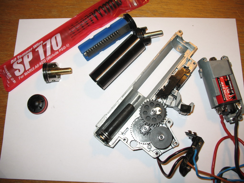 SP170 GD – základní mechabox Tokio Marui (Steyr AUG zakoupenej před 6ti lety) Stručná historie: Nějakou dobu běhal na základ cca10 000bb, pak přišla SP110 cca 30 000bb, před dvěma lety jsem tam šoupnul SP130(NBU GD, kola GD infinite, píst AT s polovičním ozubením, silnej motor AT, spínání přes relé atd…. 156m/s) cca 20 000bb…..nikdy mi v něm nic neodešlo, každej servis jsem dělal sám. Až před měsícem jsem špatnou demontáží urazil poslední zub na hřebenu pístu AimTop Konfigurace na SP170: 2 roky střílenej silnej motor AT, 2 roky střílený kola GD infinite, ze vzduchu GD NBU jsem použil jsem válec a dokoupil jsem ocelovou hlavu válce ASPro + duralovou rovnou hlavu pístu ASpro(původní plastový GD by asi nevydržely), píst jsem byl nucen pořídit SHS s polovičnim ozubenim, ptž prostě nic jinýho pořádnýho nejde sehnat  , trn systema bez díry jsem kvůli montáži nahradil levnym BigDragon s dírou, NBU trysku ASPro 24,8mm jsem chtěl nahradit novou NBU tryskou ASPro 25mm + zpožďovací vačka na pístový kolo, která zajistí, že je komora dýl otevřená a otevře ji o nějaký 0,2-0,3mm víc. Základní hopkomoru(byla prasklá a odskakovala od mechaboxu) jsem nahradil kovovou GP, guma černá GD, hlaveň 550mm 6,02 GD, spouštění přes 30A autorelé, použita 30A autopojistka, silový kabely 2,5mm silikon, akumulátor nějaká Lipolka 11,1V 1500mAh 20C z modelů Walkera(měl jsem ji kdysi zadara) Montáž: Hlavně jsem vyhodil ložisko v pístu, který je zbytečná zátěž a nahradil vyseknutym kroužkem ze silný silikonový gumy a 0,5mm ocelovou podložkou pod pružinu. Oproti ložisku to nic neváží, podkládá to pružinu a zároveň si od toho slibuju nějaký tlumení toho prvního nárazu, když kola „nabíraj“ píst. Pak nastalo odlaďování vzduchu na starý utahaný SP130, nová delší tryska 25mm sice podávala, ale vzhelem k blbýmu tvaru jejího čumáku žmoulala hopgumu a netěsnila, musel jsem to nahradi starší a kratší verzí tryska od ASPro s jinym úhlem zkosení. Na týhle utahaný pružině se mi to povedlo odladit na 144m/s, s tím, že výkon na chronu začínal na 137m/s a pak se dostal na 144m/s a tam držel(neumím si moc vysvětlit), pak teda přišla pružina SP170 a pomoc kamaráda při cpaní do boxu (tímto zdravím Kapra  ), pro lehčí montáž byl použit zmíněnej trn BigDragon s dírou. Zbraň je překopaná na jednotlivky. Zbraň se podařilo rozohnit, ale vždycky pár výstřelu trvalo, než se zahřála a začala střílet pořádně, na chronu se to projevovalo tak, jako u SP130, začala na 159 a pak se vyškrabala nejvýš na 177m/s a tam zůstala(na tu pružinu je to dost málo, čekal jsem aspoň 185m/s) Defekt: vystřílel jsem nějaký kule abysme se seznámili a pak přišla první akce, během akce jsem musel do zbraně, ptž se mi kola zastavili ve špatný poloze při jednotlivých a musel jsem je protočit dávkou, jinak to střílelo krásně a daleko…..všichni furt: „co v tom máš, že to lítá až k nám?“ Ale pak přišel najednou zvuk protáčejcích se kol a říkal jsem si, co asi prasklo. Po rozebrání doma jsem zjistil, že se rozšrouboval trn(za to se stydím, nechal jsem tam origo krátkej šroubek a nezalepil jsem závit  ), jeho špička se vzpříčila v pístu tak, že se nemohl natáhnout, no a kola prostě vyrvaly ozubenej hřeben, urazily zadek pístu a vesele se točily dál. Celkem na SP170 vystříleno cca1000kulí. V tuhle chvíli přemýšlím, kterej použít píst s POLOVIČNÍM ozubením, a co s tím vzduchem a podivně stoupajícím výkonem…..poradí mi někdo, co s tím?? Na novej vzduch prachy nemám, tak zkusím použít jinou vazelínu a vyměnit hopgumu, ptž použitá už je stará. S pístem s plným ozubením na mě nechoďtě, ptž s převodama GD Infinite jsem spokojenej. Závěrem přikládám pár fotek a chci říct, že takovýhle brko není problém do trojkovýho boxu konkrétně od Marui narvat, jen se nad tím musí přemejšlet a umět to odladit...což není jednoduchý.