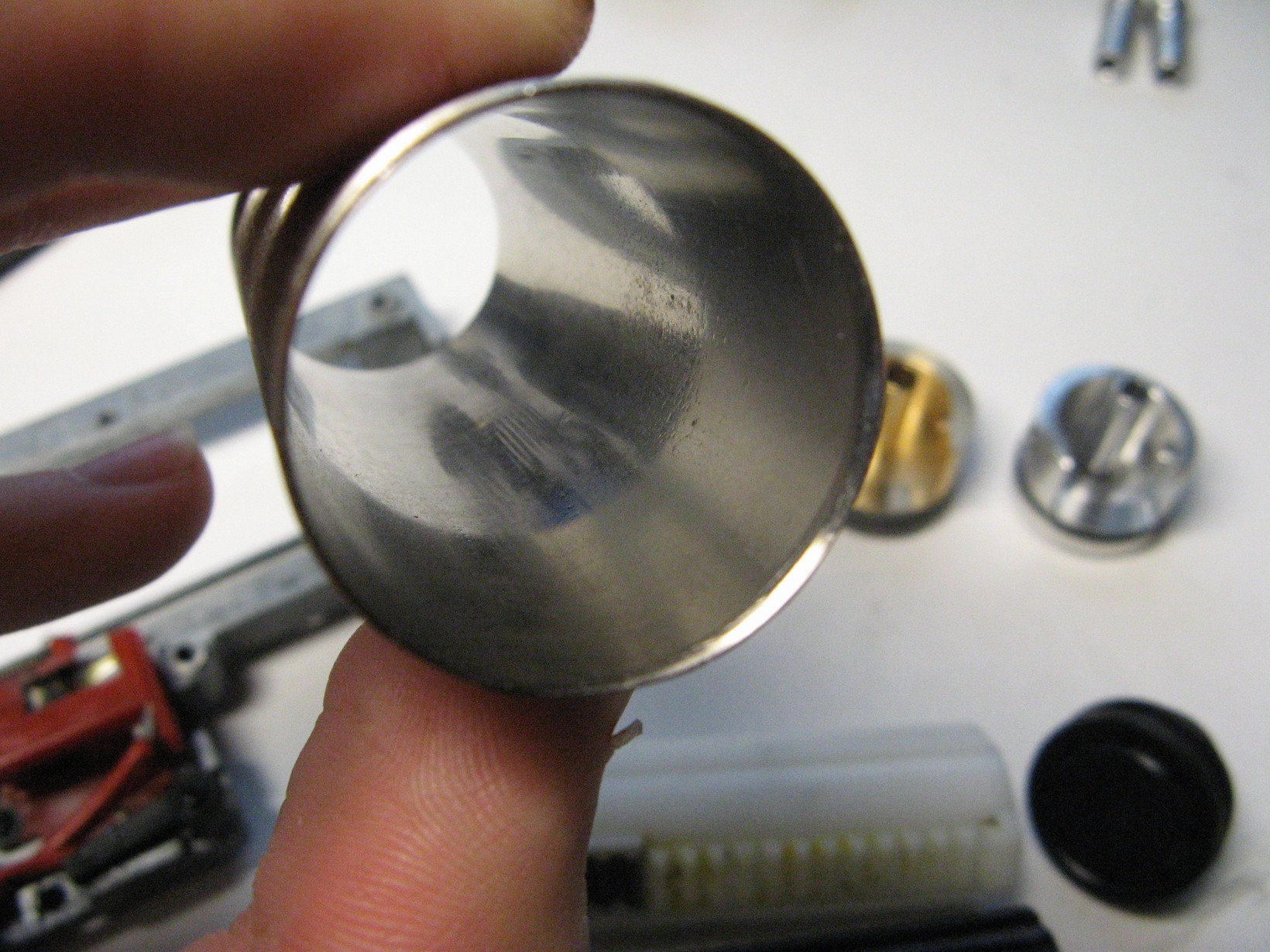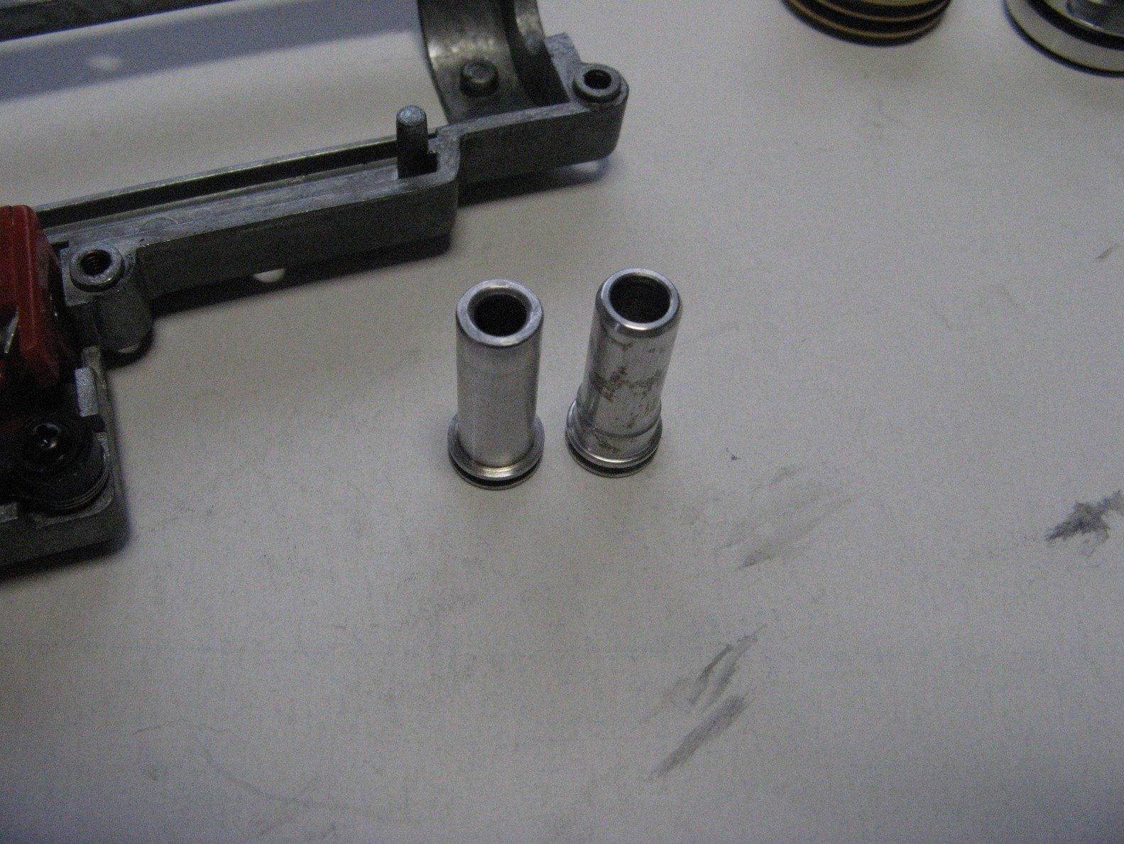 Nazdar! Tak jsem se rozhodl upradovat svoji M16A4 od GP na pružinu M120. Hlavní část upgradu tvořilo toto: http://www.guruupgrade.com/sety-valce-n ... nikl-profi . Dále jsem přidal mosfet a hop-up gumičku a pružinu od guarder. Když mi tento set přišel, měl jsem rozporuplné pocity. Píst měl 14 kovových zubů (na stránce psáno 16) dva evidentně zbroušené na konci. (přisuzuji to chybě stránek, jelikož na obrázcích měl taky 14 zubů). Válec my přišel jakýsi hrubý (myslím vnitřní povrch ne vroubkování svrchu na odvádění tepla) a lehce špinavý (nešlo vyčistit suchým papírovým kapesníčkem) což mně moc nepotěšilo. A tryska byla z vrchu čímsi zašpiněná. Dále dorazová guma na hlavě válce měla uprostřed jakýsi výron. Celkově jsem čekal lepší zpracování, jediné co má u mně 10 bodů je hlava pístu která je zpracovaná opravdu luxusně. Dnes jsem zbraň otevřel a koukají na mně další překvapení: píst GP má 15 zubů (tři kovové). Válec (plný, bez díry) s hladším vnitřním povrchem než ten od guru. Takže se ptám: je ten válec v pořádku? Čím mám ten válec čistit? Nebude menší počet zubů na pístu dělat problémy? (asi ne díval jsem se na obrázky jiných pístu a počty jsou buď 15, nebo 14 zubů jen nemám praktické zkušenosti). Je ta tryska v pořádku? A copak GP má v základu NBU vzduchárnu nebo je to jen zvláštní válec bez díry?. Foto: