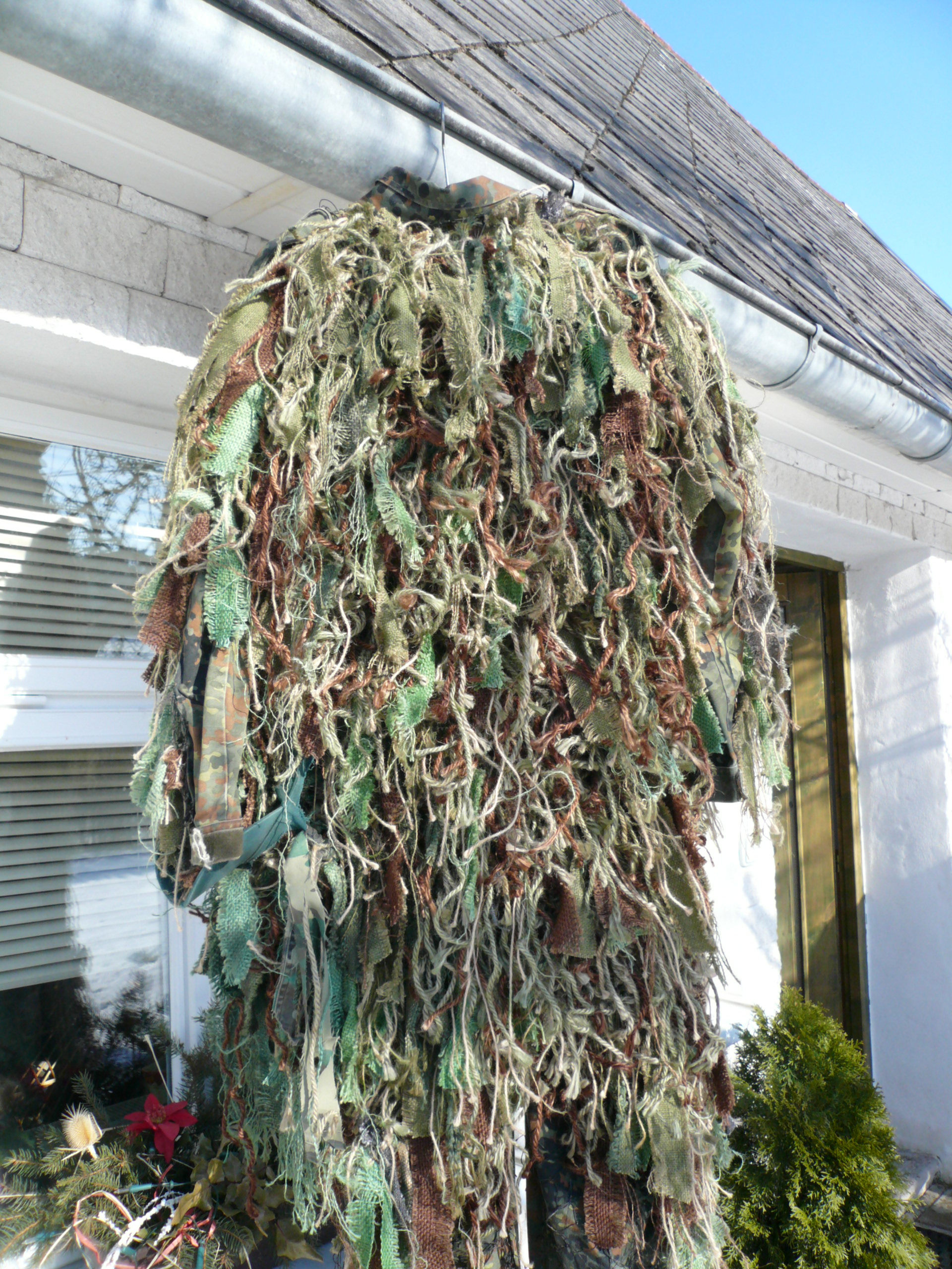 já sem toho hejkala mnohokrát upravoval,když ho vytáhnete poprvé do lesa,tak zjistíte co chybí,přebývá atd,pak když sem uviděl jaká hrůza to je,vzal sem nůžky a už sem stříhál a páral a upravoval,nakonec sem tam ještě namotal jutový provázky a proužky odpáraný z pytle(vše obarvený + základní jutová barva) pak když už se hejkal přiblíží vaši představě,nesmíte zapomenout na přírodu  .. a jak sem psal a stojím si za tím..je lepší udělat světlejší odstíny..protože líp to stmavíš než zesvětlíš. Jinak až dodělam Ghillie Cape No.2 dám sem fotky od začatku po konec.
