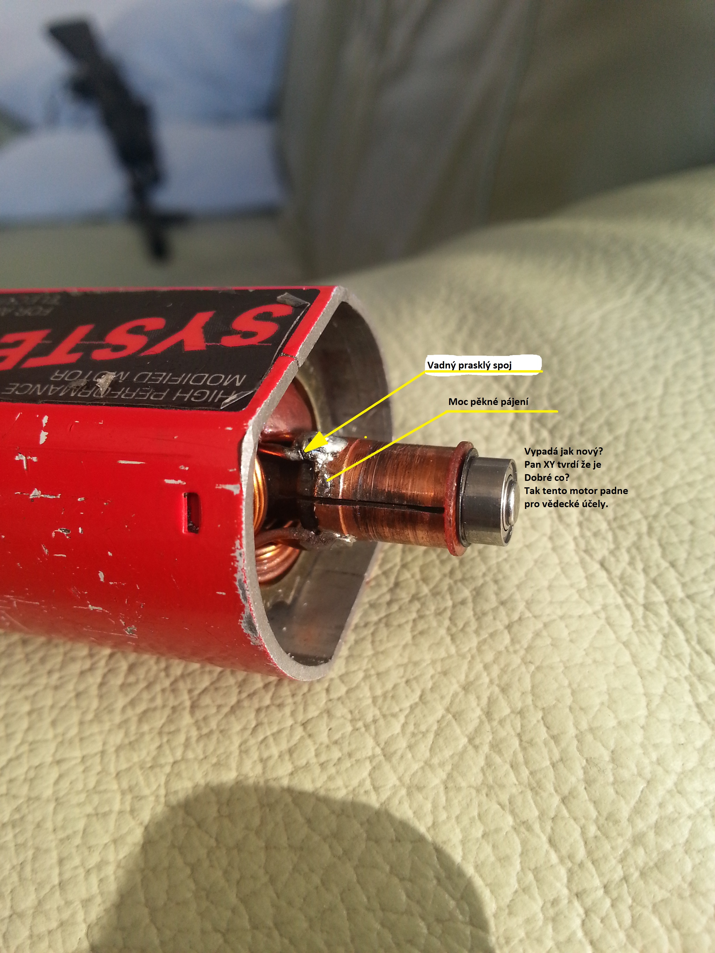 Obětuji tento motor ve prospěch zkoumání, jelikož se mi zdá tvrzení pana XY za nesmyslná. Zdali dojde k poruše motoru po vystřílení např. 2 zásobníků, tak mám za to, že tento motor je do zbraně tohoto typu (s tímto chlazením) naprosto nevhodným a nechápu, jak odborná firma si může dovolit toto prodávat neboli provádět takovýto upgrade. Myslím si, že celý problém spočívá v ochraně motoru proti vysoké provozní teplotě a jejím účinném chlazení. Proč není dodatečná ochrana motoru? Nebo, proč není například madlo hliníkové (pálím se, nestřílím) aby chlazení bylo výrazně lepší? Chápu ortodoxní airsofťáky, že ve skutečné zbrani také není madlo hliníkové, tím spíš si myslím, že u tak výkonných motorů musí být zajištěno dostatečné chlazení, že většina z vás není odborníky (možná se pletu) a tím pádem důvěřujete obchodníkům, kteří vystupují na internetu, tak jak vystupují. Já jsem byl naprostý laik, co se týče zbraní a jejich funkcí ale po těchto zkušenostech jdu do toho a budu vše, co jsem se dozvěděl zde zveřejňovat.