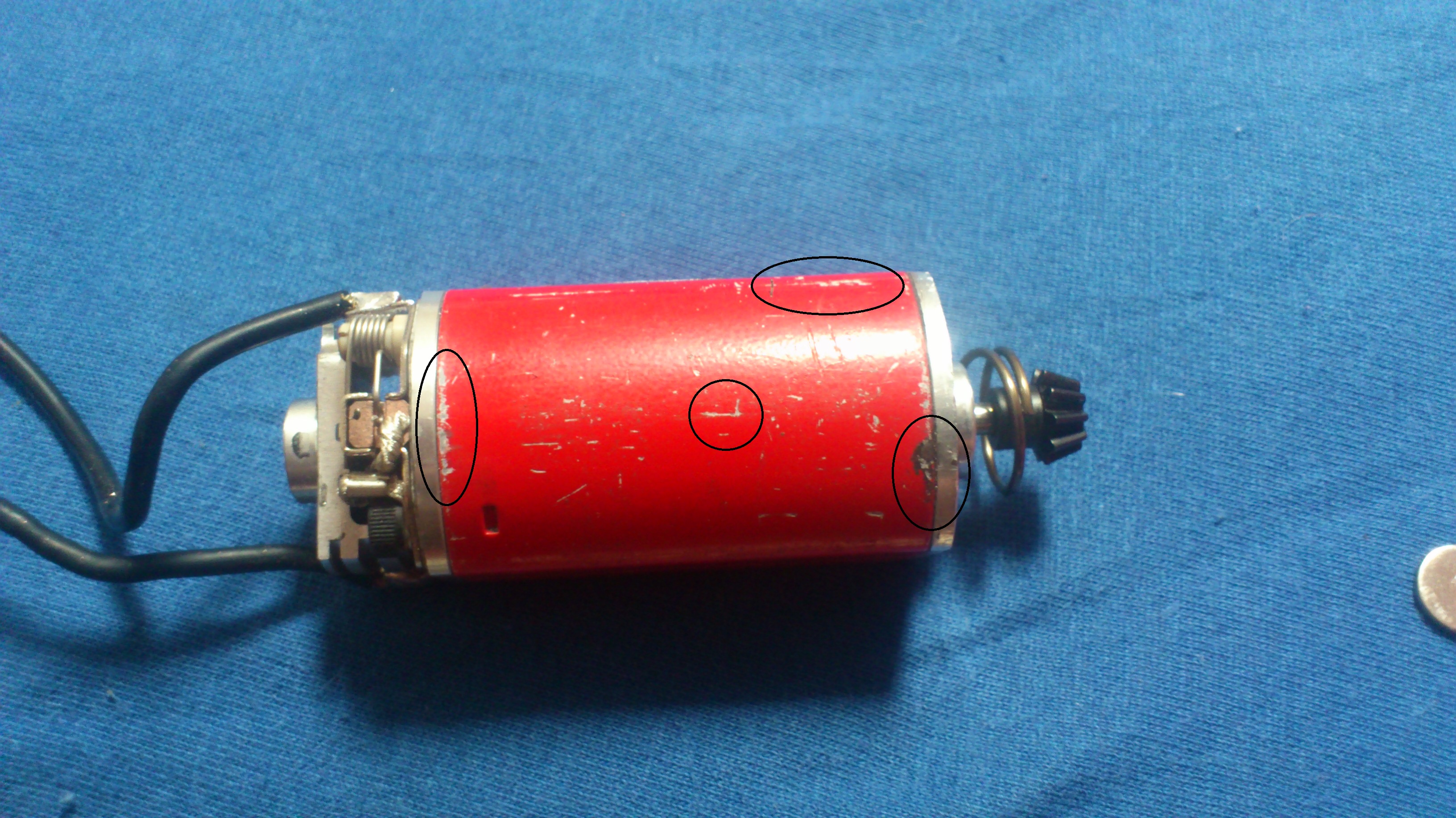 Po uvedeném telefonátu jsem se rozhodl podívat, co se stalo se zbraní a zjistil jsem, že do motoru po zmačknutí spouště jde napětí. S toho vyplývá, že je závada v motoru samotném. Po změření jsem zjistil, že cívka na rotoru je přerušená. Po podrobném ohledání hodinářskou lupou jsem nalezl studený spoj na komutátoru kde je přiletován drát od cívky. Podotýkám, že výše uvedená závada byla již jednou reklamována a dnešním telefonátem s panem XY mi byla tato skutečnost sdělena. Jedná se tedy o závadu stejnou již druhou. Musím konstatovat, že po výrazném zvětšení na fotce bylo zjevně letováno a dle mého laického názoru ne poprvé (foto přiložím). Ostatní upgrade díly nechám na prověření znalcem a prozatím nebudu zbraň rozebírat. Takže CNC mechabox 8mm a jeho náplň a další díly budou i nadále tajemstvím (prozatím).