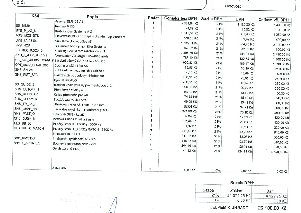 Přikládám scan faktury a podotýkám, že v ceně není hlaveň INOX od SYSTEMY za 969,-Kč a optika SVD za 2.970,- Jako kompletní dárek jsem myslel, že bude vše ok ale není.