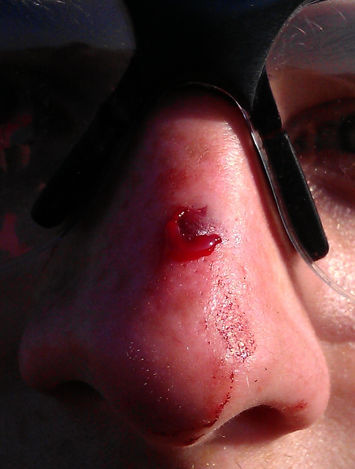 Tak tohle se mi objevilo na nose dneska. Asi nějaká alergická reakce nebo co... Sniper - 170 pružina, on v baráku, já venku. Trefil mě tak na 10-15m. Měl jsem hlavu v díře v obvodové zdi o rozměrech tak 50x50cm a on mě mířeně trefil do nosu (ještě se chlubil tím "mířeně"). No koukal jsem na něj, jak mu visí na stehně plynovka a když jsem se ho zeptal, proč mě netrefil tou, tak se oháněl tím, že by mě netrefil  No tak jsem mu sdělil, že si na něj příště vezmu svoji Slavii...na takovouhle dálku nestřílím ani svým SRkem a to dává "jen" kolem 150, možná míň. Jinak zajímavá zkušenost - nejdřív rána, bolest projela celou hlavou, pak zvonění v uších...a k dokreslení téhle takřka filmové atmosféry za mnou někde bouchl dělobuch