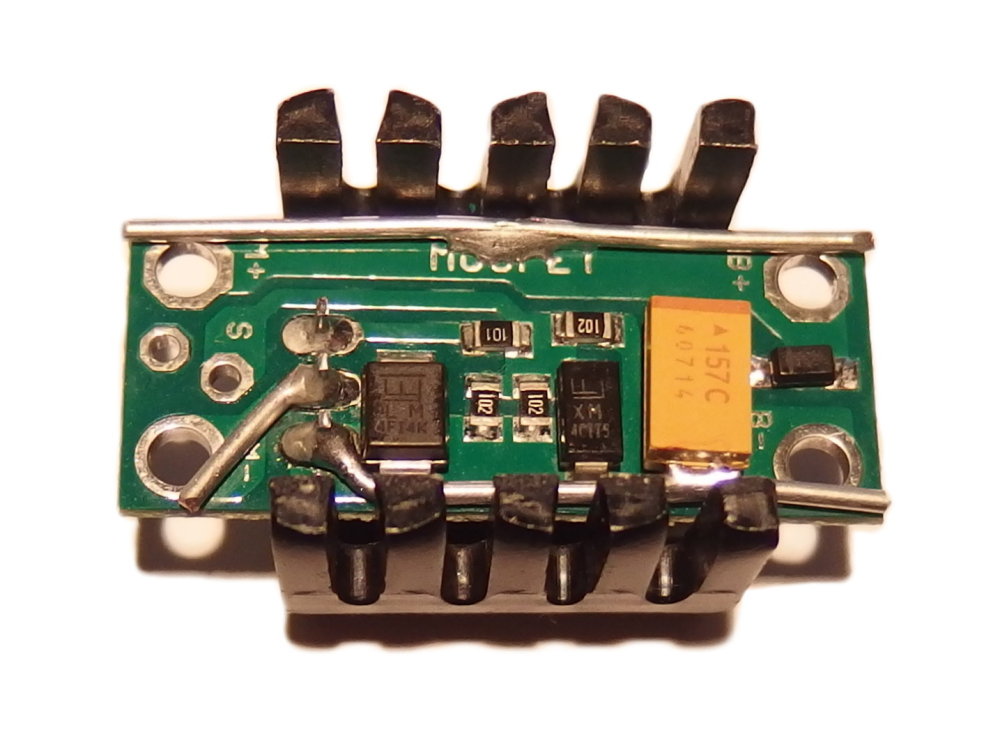 nejake info o dosavadni verzi: je tam mosfet do umi dat az 400A(spickove proudy trvajici maximalne par desitek milisekund). Je to nejlepsi mosfet, co jsem v CR sehnal, ma 4x mensi odpor pri sepnuti nez mosfet, co pouzivam v normalnich mosfetech, ale taky je 3x drazsi. Navic je na mosfetu pripajeny masivni chladic. Jeste jsem posilil cesty na desce dratovyma propojkama. Rozmery jsou: 32x20x15mm. Foto v priloze