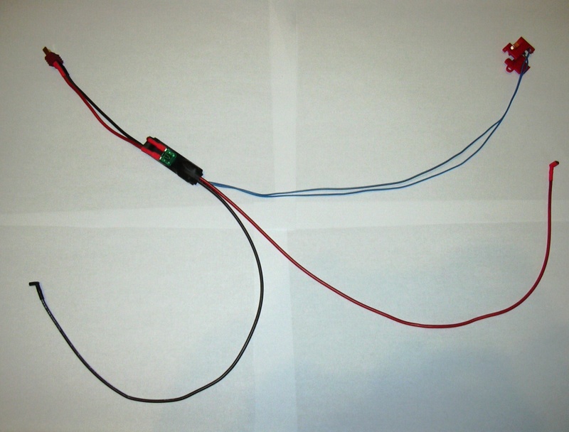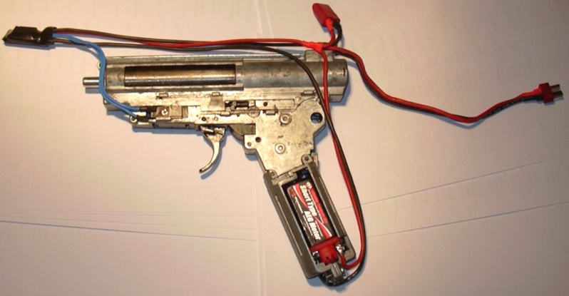 Na fotce je na zakázku vyrobená kabeláž pro zbraň M4a1 s baterií uvnitř předpažbí. Spoušťové kontakty byly použity původní ze zbraně.