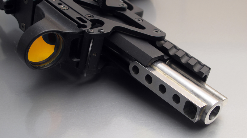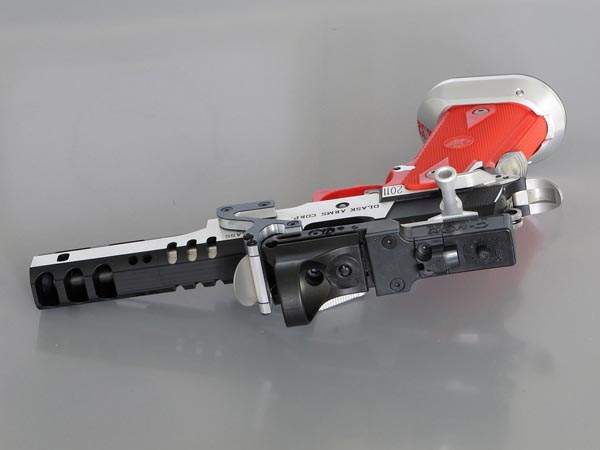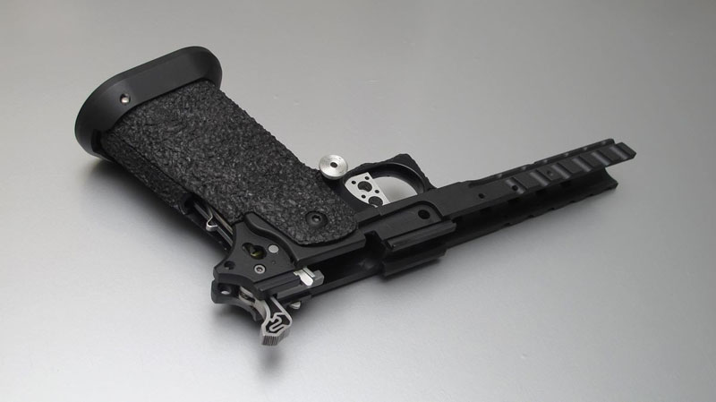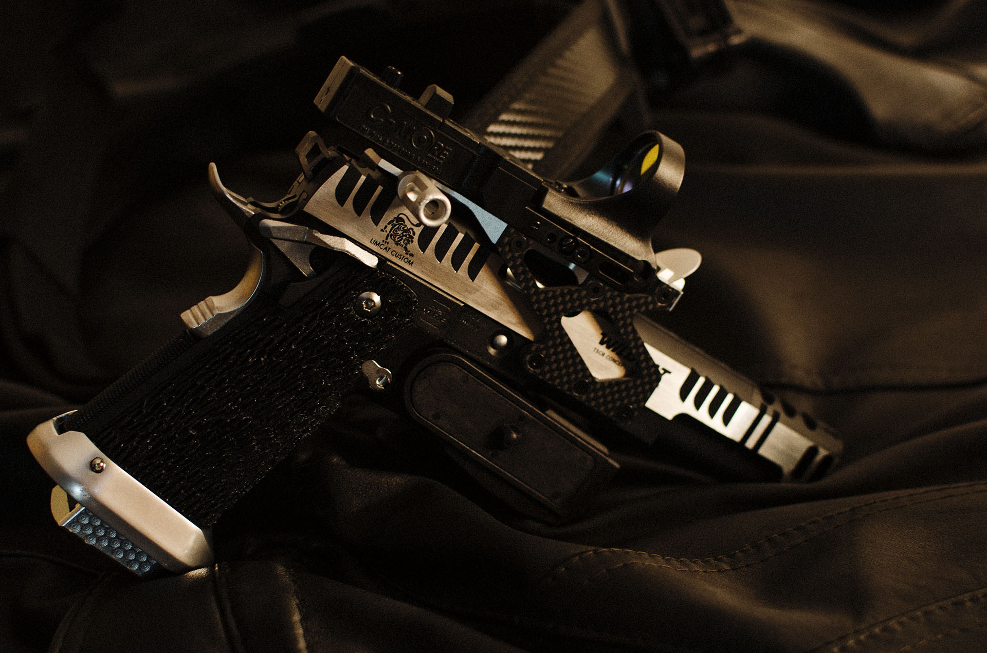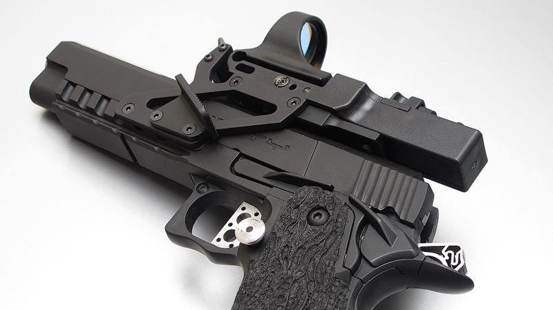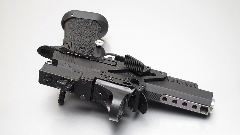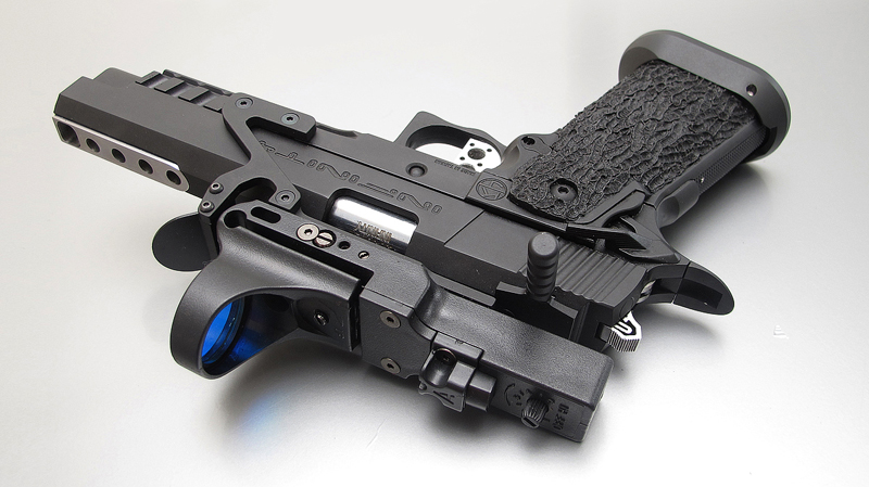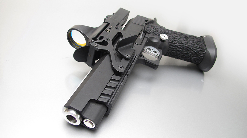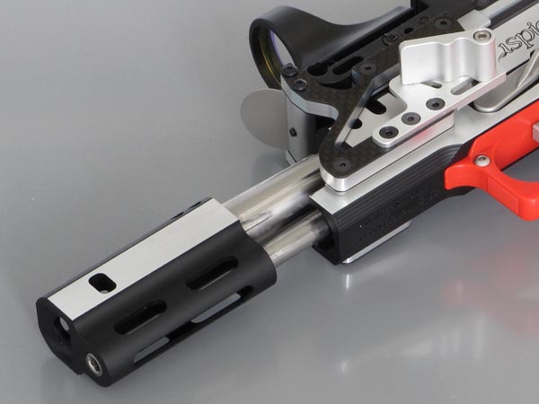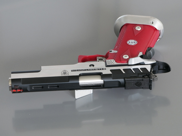 TM Hi-capa 5.1 - Limcat custom Gunsmith - Mike Cripps - EnglandZáver - ProHandgun Limcat Wildcat custom 6" + kompenzátor + oceľová vonkajšia hlaveň Rám - Tokyo Marui Hi-capa 5.1 čierna so striebornými ovládacími prvkami Elite Custom - 6" nerezová vnútorná hlaveň 6.02 mm ProHandgun duralová nastaviteľná spúšť - odpor 0,9 kg ProHandgun oceľové kladivo STI style magwell AIP loading nozzle NineBall HopUp AIP Blowback light unit Guarder springs 150% C-more replika AIP carbon montáž na optiku Elite Custom grip duralová naťahovacia páka hammer plate (ochrana záveru pred odtlačením od kladiva) duralový thumb rest AIP magazine bases - duralové - strieborné Skrátený chod záveru - short stroke buffer