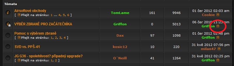 Poznámka: červeně je označena šipka pro zobrazení nepřečtených příspěvků v tématu