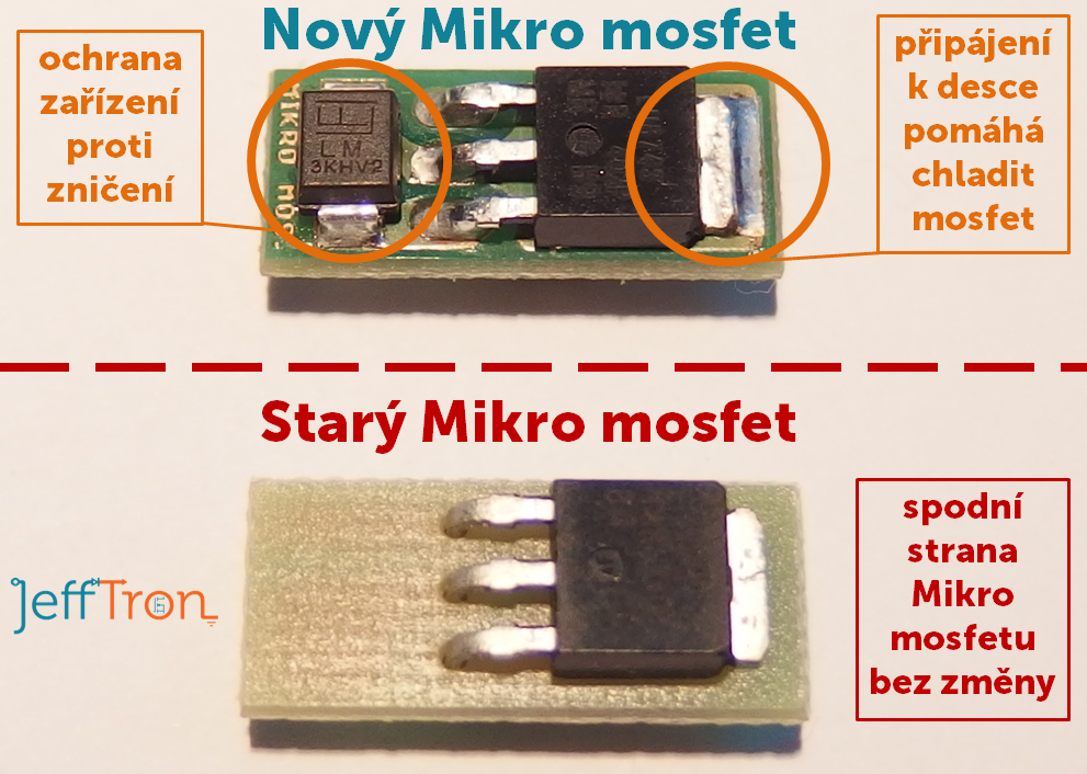 Představuji Vám vylepšený Mikro mosfet s následujícími úpravami: - Přidána součástka chránící Mikro mosfet proti poškození - Tělo mosfetu je přípájeno k desce, měď na desce působí jako malý chladič. Pomáhá tím Mikro mosfetu k vyššímu možnému zatížení. Cena za zařízení ani jeho rozměry se nemění. Tento nový Mikro mosfet můžete objednat ihned v JeffTron eshopu: http://www.jefftron.cz/Mosfet/Mikro-mosfet.htmlMikro mosfet s univerzální kabeláží bude nahrazen touto verzí po doprodání starých skladových zásob