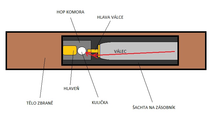 Tak sem narazil na další problém (nejspíš) a ten je že když natáhnu zbraň, nechám vytáhlej válec, tak se kejve ze strany na stranu, když válec zase zasunu tak u hop komory se zasekne a musim vynaložit větší sílu na to, abych dostal kuličku do hlavně k hop gumičce. ČERVENÝ šipky ukazujou jakym cca jde válec směrem. Za nějaký vysvětlení nebo vyřešení problému budu hodně rád  ) Díky moc ...