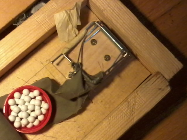Jako první si sestavíme krabičku, která bude obal miny. Vezmeme prkno a uřízneme ho přibližně na délku dvou pastiček na myši( je lepsi si nechat par cm jako rezervu).Prostor v krabičce má být přibližně stejně vysoký jako je natažená pastička. poté pastičku přeřízneme na polovinu a necháme si tu s pružinou. Ty připevníme na dno krabičky tak, aby v nenatažené pozici koukal drát (který normálně zabijí myš) ven.K drátu přišijeme látku tak, aby byla napnutá když jsou dráty přesně v polovině úderu. Doprostřed látky připevníme malou nádobku, kterou naplníme kuličkami, hráškem nebo prostě tím, co je poruce. spouštěcí mechanismus vyrobím pomocí silného drátu ohnutého do tvaru u. ten vsadíme do dvou vyvrtaných děr, jedné ve poklopu a druhé ve sťeně krabice. pak jen přidáme náplň kuliček a natáhneme pastičky. nádobku uzavřeme a od zavíracího drátu navedeme provaz