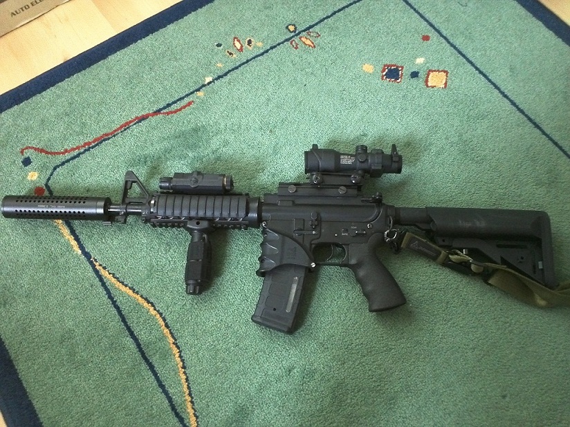 Pěknej tlumič...ten úchyt na šachtě je hroznej, lišta pod ACOGem taky. Máš to 4x32 ACOG nebo jen kolimátorovou náhražku? Jestli jako kolimec, tak to tam AN/PEQ nemůže vadit  tam jde o tu tečku a ne to co vidíš vpředu...já mám třeba aimpoint zakrytkovanej zpředu a to permanentně...mám tam je malou dírku abych případně pravým okem viděl tu správnou část těla. Ale dá se s tím běhat i s komplet zavřeným, protože se do toho čumí oběma očima.