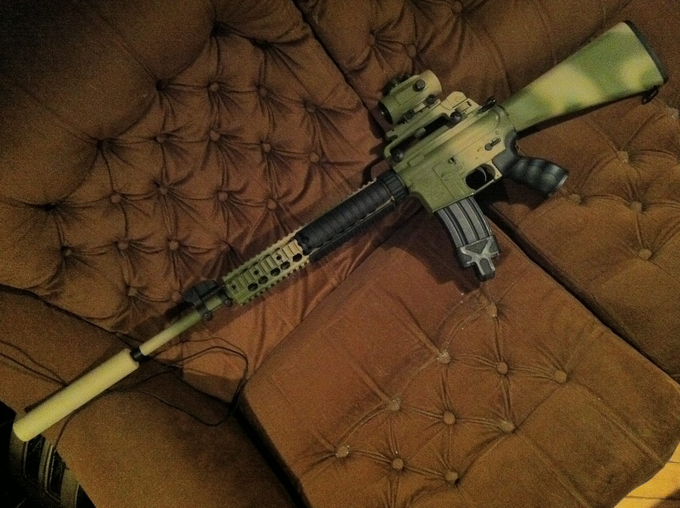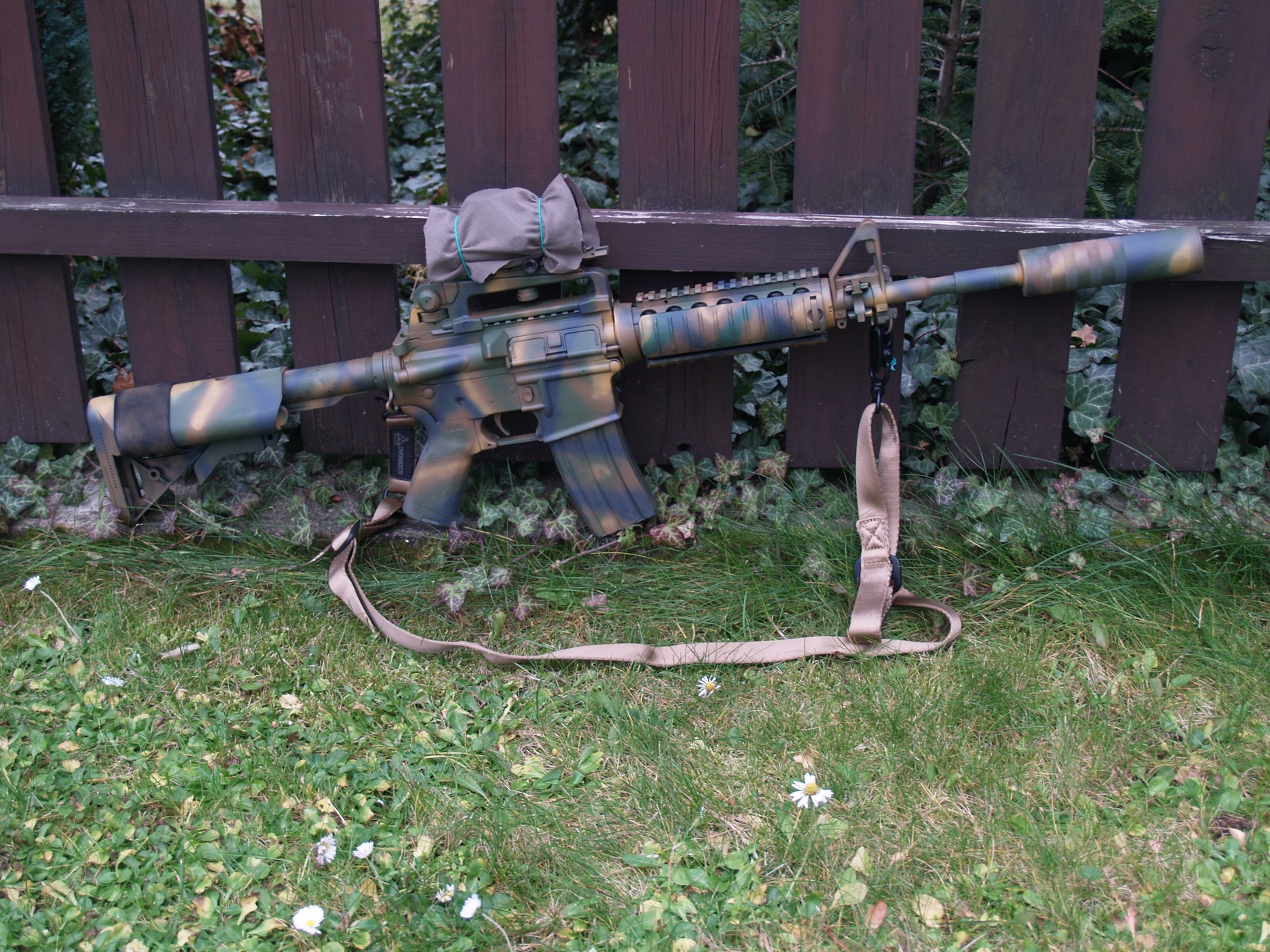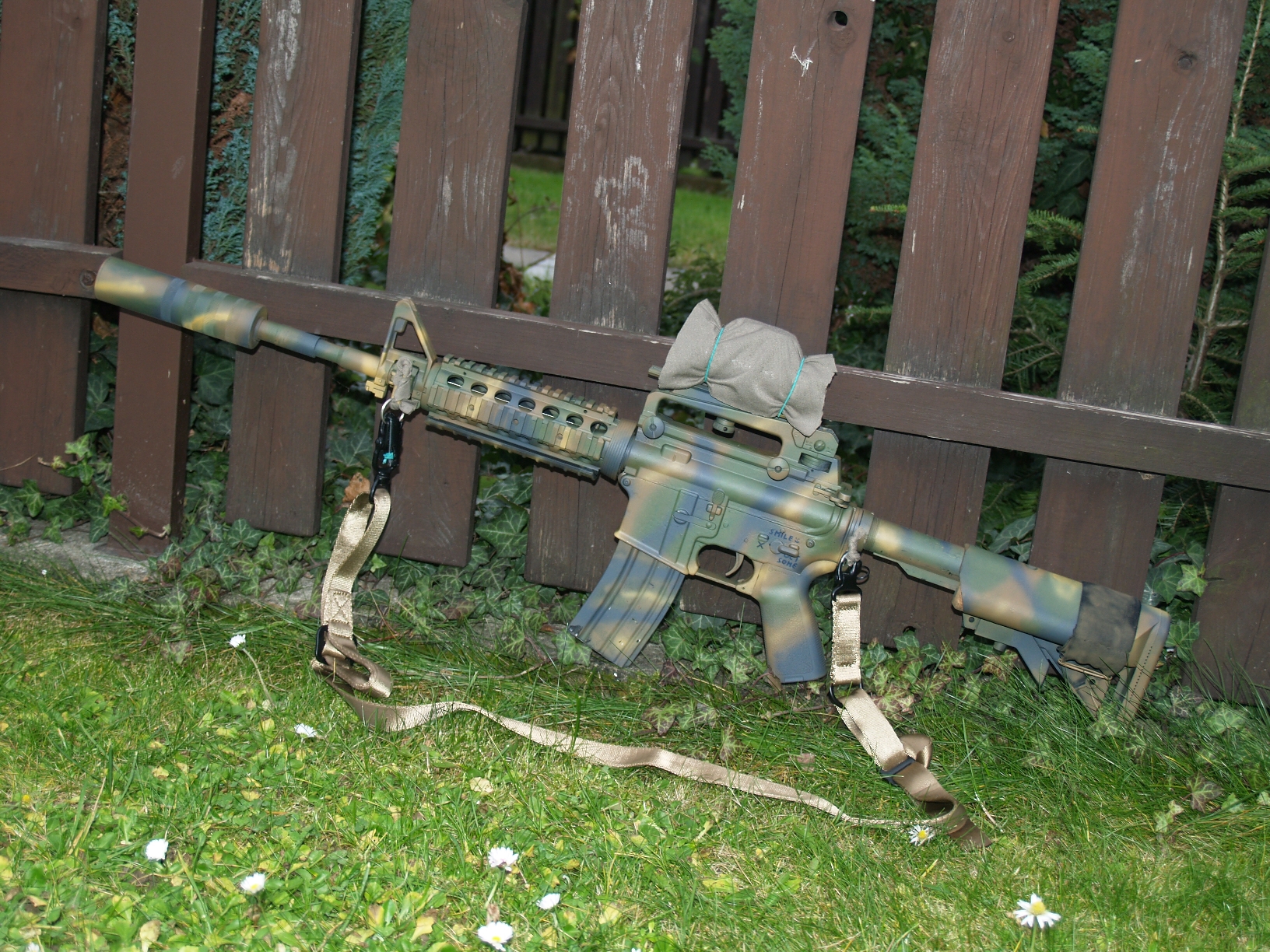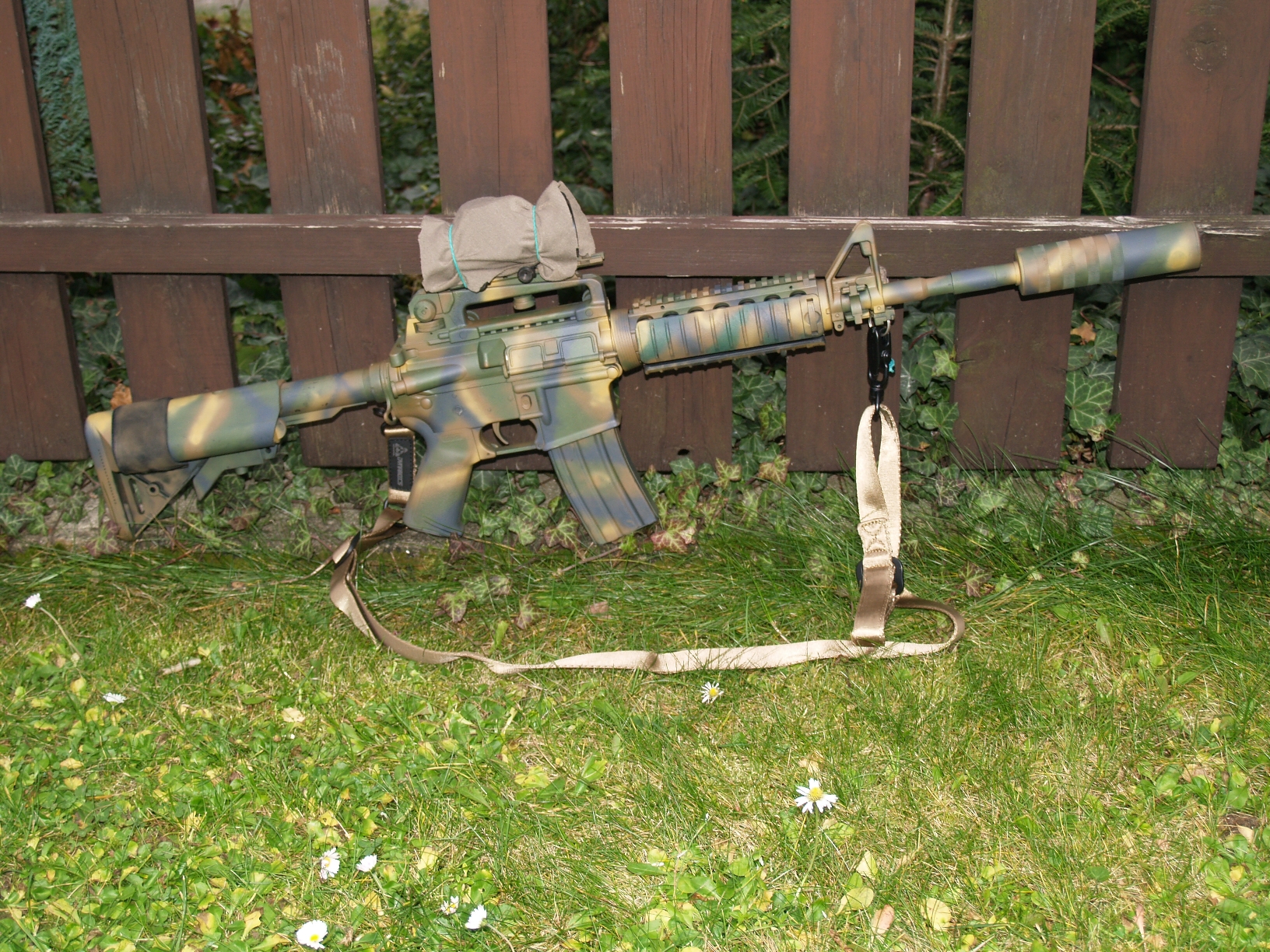 Tak jsem si taky hrál: - staré humbroly, co s něma no, něchtěl jsem je vyhodit a drží dobře - zadarmo -pár hodin s airbrush pistolí -na tom lak ve spreji - matný - obi za 100,- -nápisy u přepínače na žádost bratra  doplněny lihovkou - nejsou prostředky na šablonu - časem jinak účinek to má dvojí : zvedne se líbivost zbraně a druhý fakt nejdete vidět i na nějakých 15metrů pokud se nehnete a nebo nevystřelíte