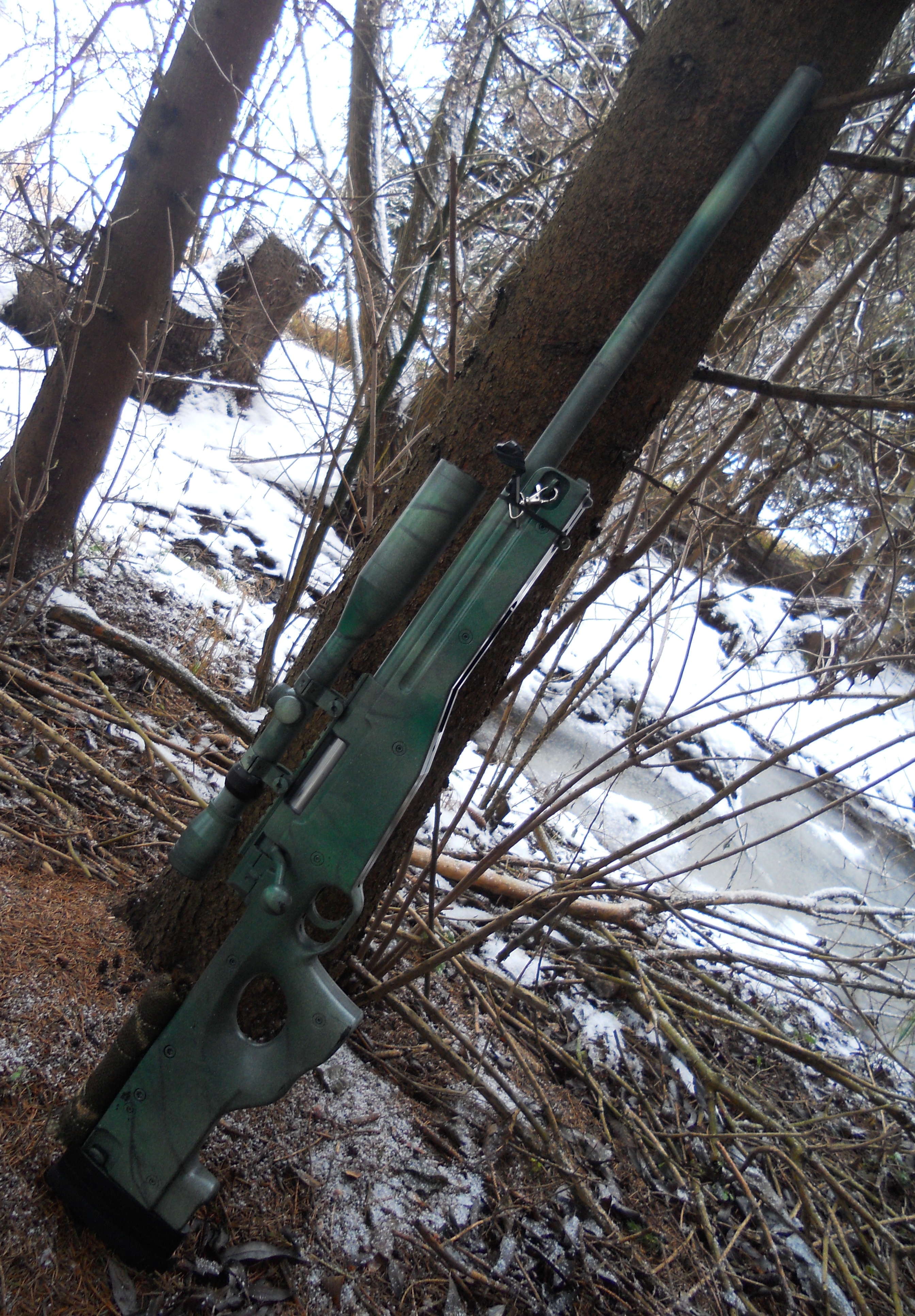 Mě se zdá, že zbraň ve stínu + sníh na pozadí ta automatika ve foťáku nějak divně zprůměrovala a tím pádem je to celý takový tmavý/přesvětlený... většinou se fotí na denním slunku mimo les (louka), kde to jde vidět asi nejvěrněji. Jinak barva taková nepřírodní, to imho ničím jiným než sprejema určenýma na kvéry nespravíš.