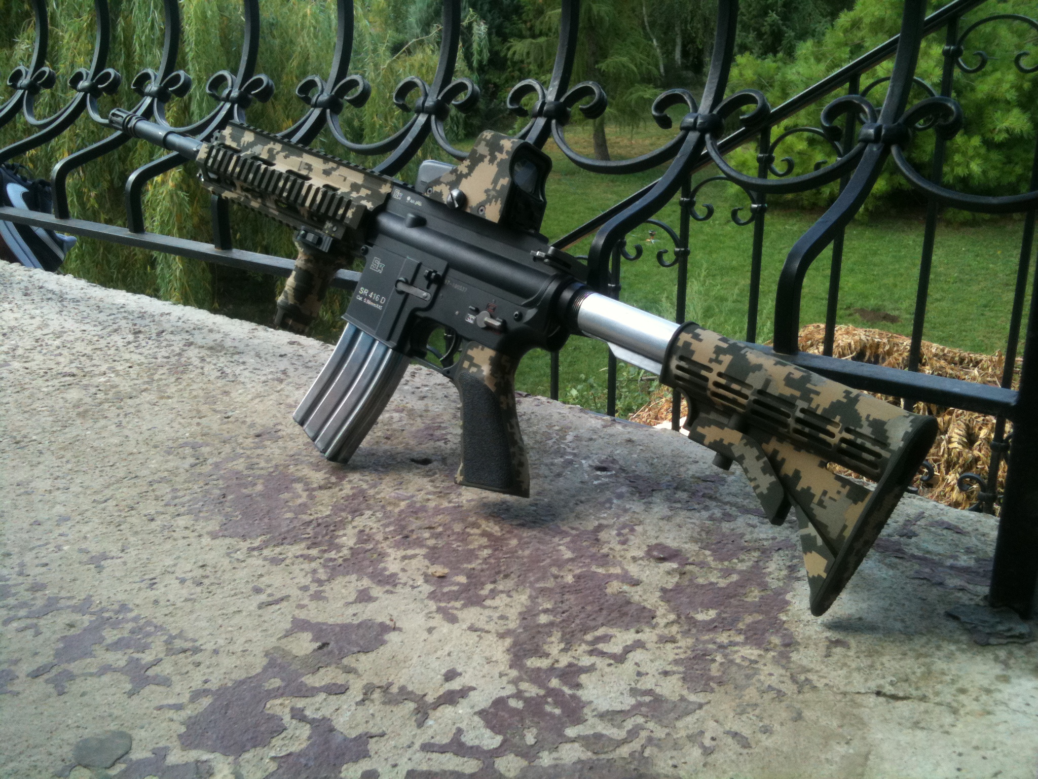 Pokud se nemýlím, tak některý verze HK416 měli stříbrnou trubku pažby. Takže to není až tak unkošér. Moc se mi to nelíbí (nemám rád kvéry stříklí do digitálu) ale za to jak jsi si s tím vyhrál máš můj respekt