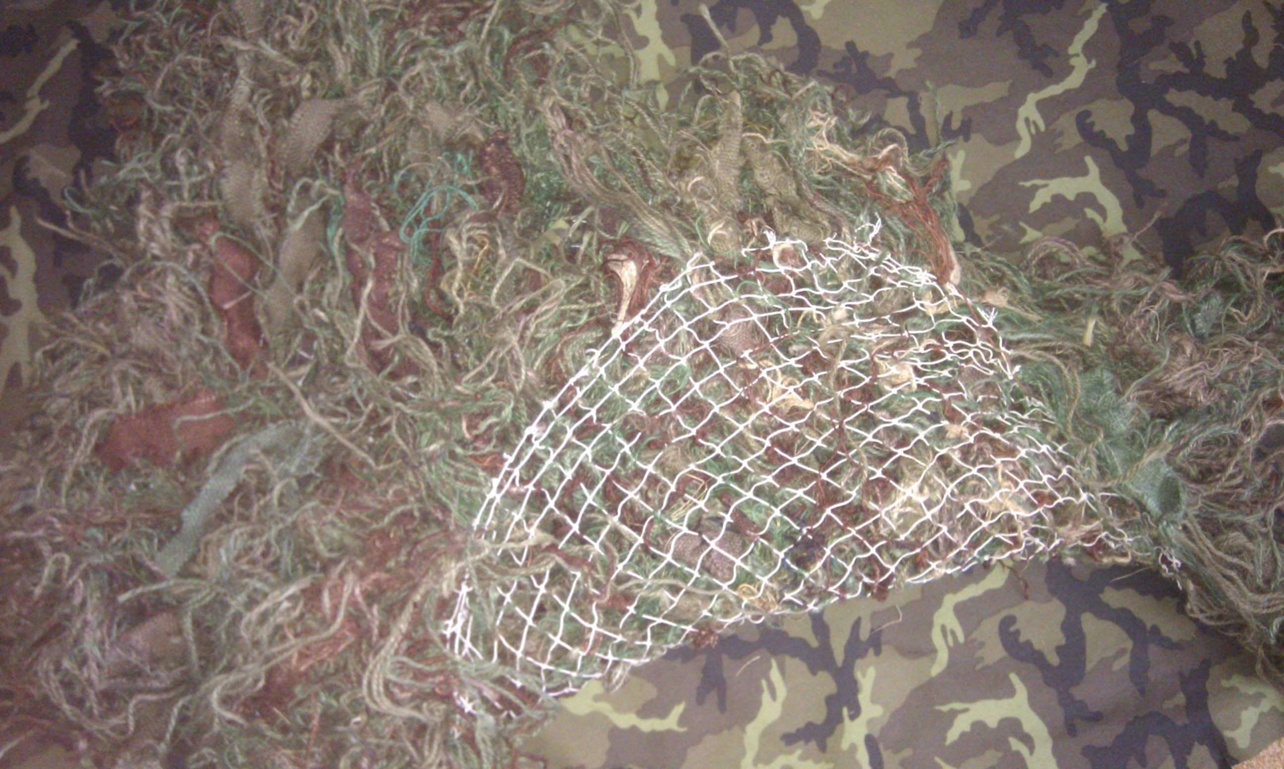 Šíť je z nějakých rybářskejch potřeb, buď něco na čeřeny, nebo najít přímo metráž rybářskejch sítí. Ale není to levná sranda. Na jiným hejkalovi jsme použily českou maskovací síť ze který jsem odstranil ten umělej mech... sice práce na prd, ale za rozumnou cenu je pak celkem kvalitní síť. Na maskáče je to přišitý ručně jehlou a nití  ne uplně v každým oku, ale řekněme v každým čtvrtým (odhadem). Použitý byli Duha a Iberia, takový ty prostě přírodní - khaki, hnědá, zelená, listová zelená apod. v různých kombinacích. Rozdíl mezi těma barvama moc není, možná v návodu k použití, ale to já moc nečtu  ... všechno barveno metodou pokus-omyl a asi 25% juty bylo na vyhození.