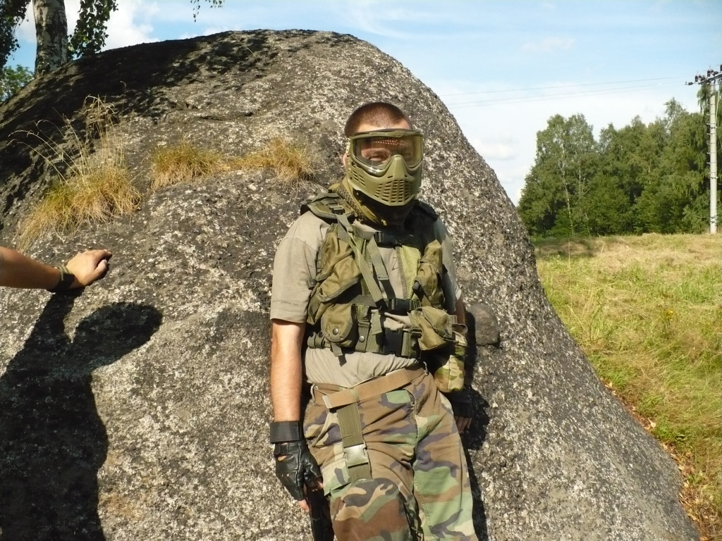 Vzhledem k tomu, že military nedělám a mám rád své zdraví, zvolil jsem paintball masku, která se dá rozebrat až na brejle, který jsou podobným těm taktickým jako např. M44. Na manuálkový bitky si vezmu brejle, na AEG masku bez kšiltu a bez chráničů na uši ... sklo je termosklo, nikdy se nezamlží, je dvojité a má certifikát proti 300 FPS přímý zásah ... ale stejně je to předimenzované jelikož mé AEG se 130 brkem to sklo zblízka neprorazí ... Modeling jde tedy stranou ...  Nemusím se bát o xicht ...