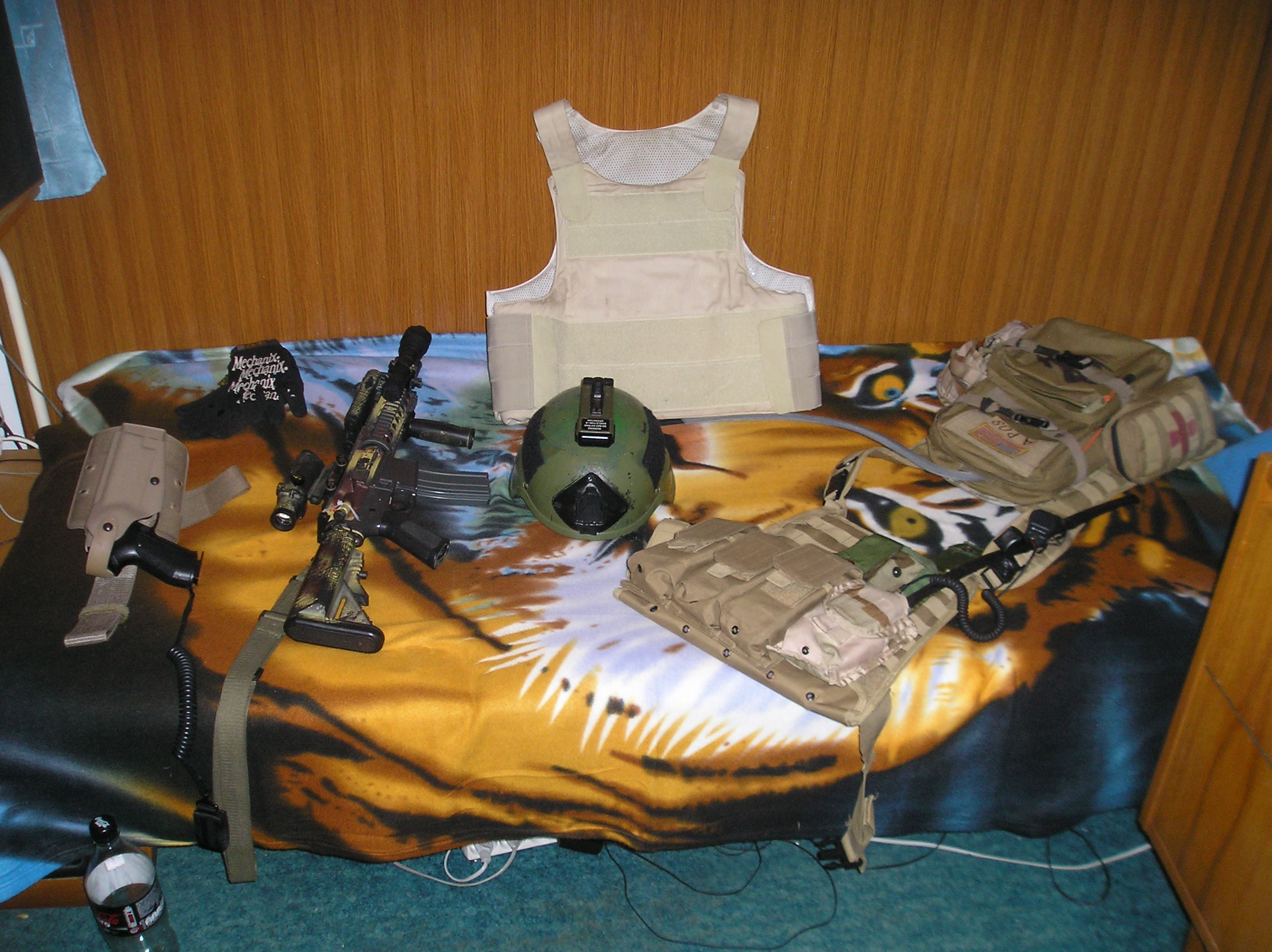 1st line: ABU kalhoty + bluza COMBAT 2000 obuti zaviraci nuz pridelany padakovkou ke kalhotovemu poutku LC3 opasek stehenni pouzdro + Beretta M92F telefonni snurou pridelana k pouzdru (planovano pouzdro safariland) Double Pistol Magazine Pouch + 2x pistol magazine Squad Medic Kit (jeho seznam viz nize) IBH helmet Hatch Knee Pads nomexove operator rukavice po kapsach: blok s pevnyma deskama, tuzky, alespon 2x zapalovac, 1x magnesium firestarter, pistalka, malej kompas (planovan nejaky stroboskop) (planovan nuz Glock) 2nd line: Tasmanian Tiger Chest Rigg 6x M4 magazine MOLLE First Aid Pouch - IFAK (obsah viz nize) Molle Frag Grenade pouch a v nem dalekohled Bushnell 8x25 Nůžky na obvazy Clinic zastrcene za MOLLE palsy par lightsticku zastrcene za MOLLE palsy MOLLE radio pouch cerna izolacka karabina se zamkem s odolnosti 20kN v tahu 10m padakovky 1x CAT turniket kapesni svitilna nejake vykuchane MRE 1l canteen (standartni US polni lahev) + varic + pititko (esus) (planovana celovka svitilna) 2.5l camel pod batoh za palsama zastrcena plastova lzice z MRE 3rd line: podle povahy mise batoh (na vyber Assualt Pack, Patrol Pack, nebo malej camel) Lekarnicky: IFAK: 1x alu folie 1x sterilni rukavice 1x CAT turniket 1x izraelsky tlakovy obvaz 1x kerlix (antibakterialni obvaz) 1x nosni vzduchovod 1x durapore naplast (civka 2.5cm x 5m) Squad Medic Kit: 2x sterilni rukavice 1x alu folie 1x CAT turniket 2x nosni vzduchovod 2x QuickClot Combat Gauze (hemostatic agens - napustena gaza) 1x izraelsky tlakovy obvaz 1x kerlix (antibakterialni obinadlo) 1x Hyfin chest seal 1x elasticke obinadlo 1x Water Jell 10x10 cm obvaz (kryti) 1x Water Jell gel 2x Sterilux 10x10 cm gaza sterilni 1x Betadine 1x Septonex spray 1x Durapore naplast (civka 2.5cm x 5m) 1x red lighstick 1x lihovy fix 1x fenistil mast 1x opthalmoseptonex alkoholove polstarky naplasti s polstarkem (planovan nejaky minor surgical kit (pean, skalpely)) (planovat pulsni oxymetr) (planovana Decompression Needle) (planovan Celox aplikator (hemostatic agens v prasku))