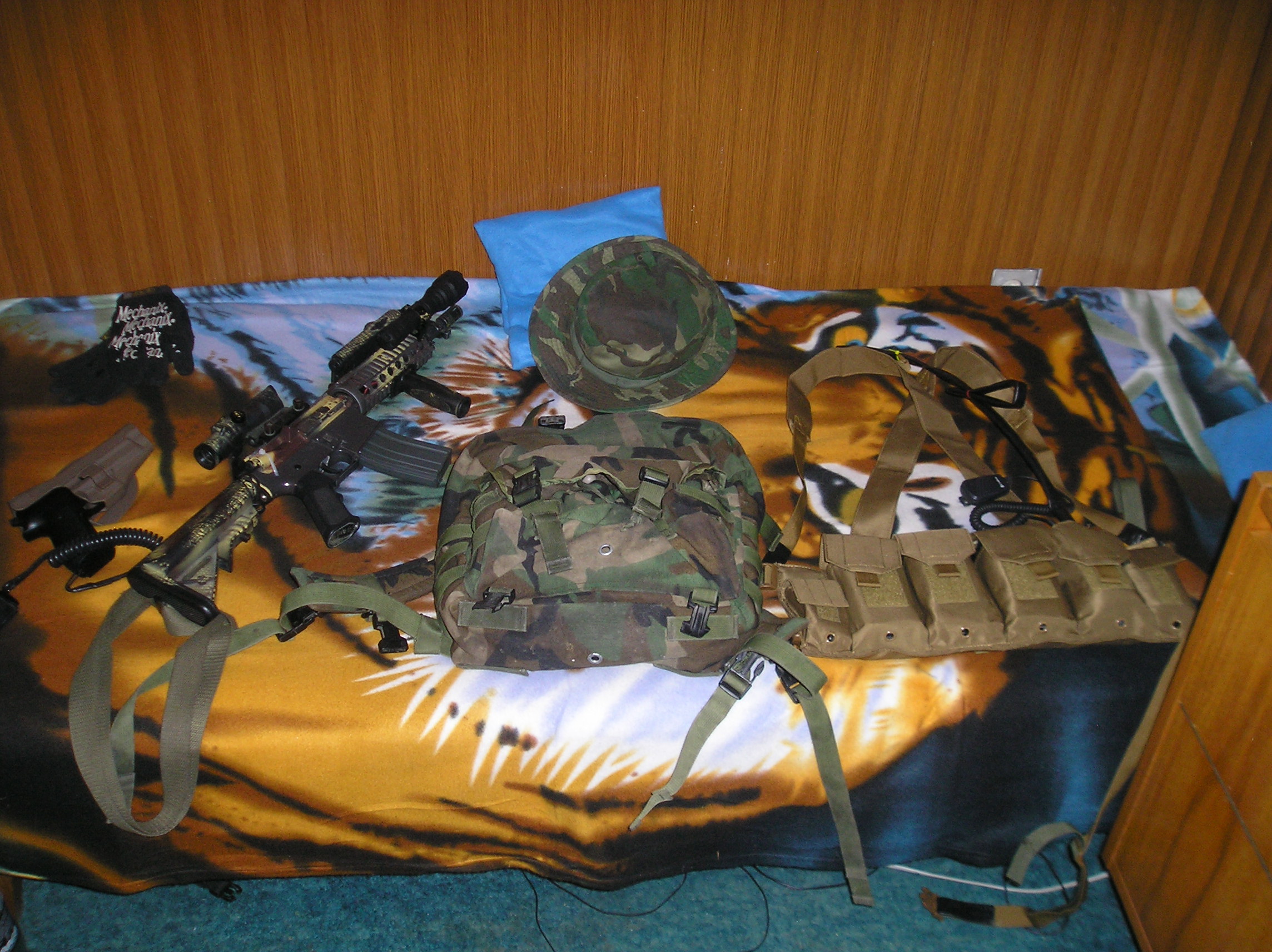 jeden SHQ pic samy obyc veci, ale ve zkratce M16A4 w/ an-peq 15 PASGT (zatim porad plast) + wdl potah PointBlank IBA cb + sds medic pouch + sds 3xdouble mag pouch bryle Bolle Viper popruh jednobodak Condor rukavice Mechanix Mpact boty Bates 85502 MCCUU marpat uniform bagl Patrol Pack( vevnitr Camelbak thermobak 3L) + sds canteen pouch + Aites IFAK a waist pack