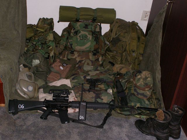 Omlouvam se ale sem linej vyfotit zvlast vystroj tak to je i s vyzbroji - stejne zadna moc neni  a ze je to tak roztahany Je tu fotka v malym rozliseni, pokud chcete videt ve vetsim tak tadyPopis z leva od shora : LBV 1.generaceLC-1 2x 1l Polni lahve s pititkama 2x M16 sumky 1x Buttpack wdl. 2x Psaníčka Patrol Pack 2x Magazine pouch - double mag - po bokách 1x Waist Pack - pod baglem do tydne pribude 3L hydr. vak od Camelbagu ->vse orig. od SDS A.L.I.C.EM56 Parka - olive->Mil-Shit T-Shirt->Rothco USA + US BDU WDL + US Belt 2x komplet Gas Mask-> ACR 3D BDU-rip stop WDL rip-stop Poncho+vložka P29 9mm (beretta 82R)->Ekol&Voltran UTON AZ 07 s bajonetovou čepelí->ACR USMC capUS Bonnie HatM16A3+Aimpoint +tlumič 20cm Socom ->G&P UHF Motorola GP300->Motorola US Speed Lace - Combat boots*eště tam chybí Smith Wesson SW53B a pár nesmyslů jako je nádobí apod. a Kde neni uveden výrobce tak je to orig. US