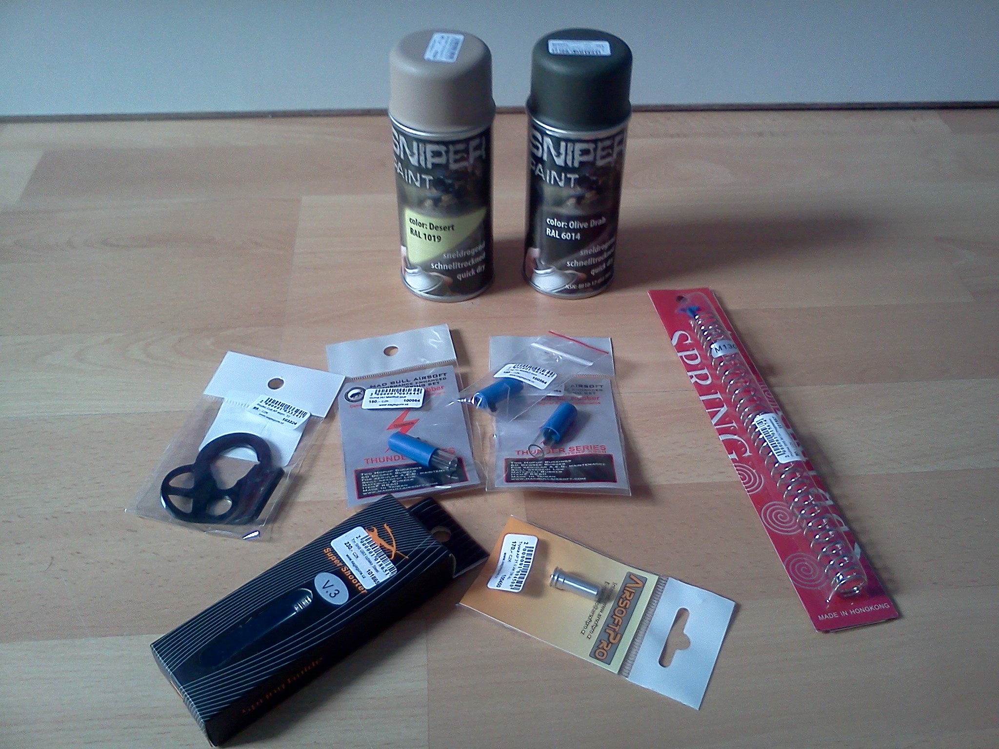 malá objednávka z eagleguns SHS pružina SHS trn ASPro tryska 3X Madbull modrá guma zadní úchyt popruhu k M4řce od ASPro Khaki a Olive Drab sprej od Sniperpaintu