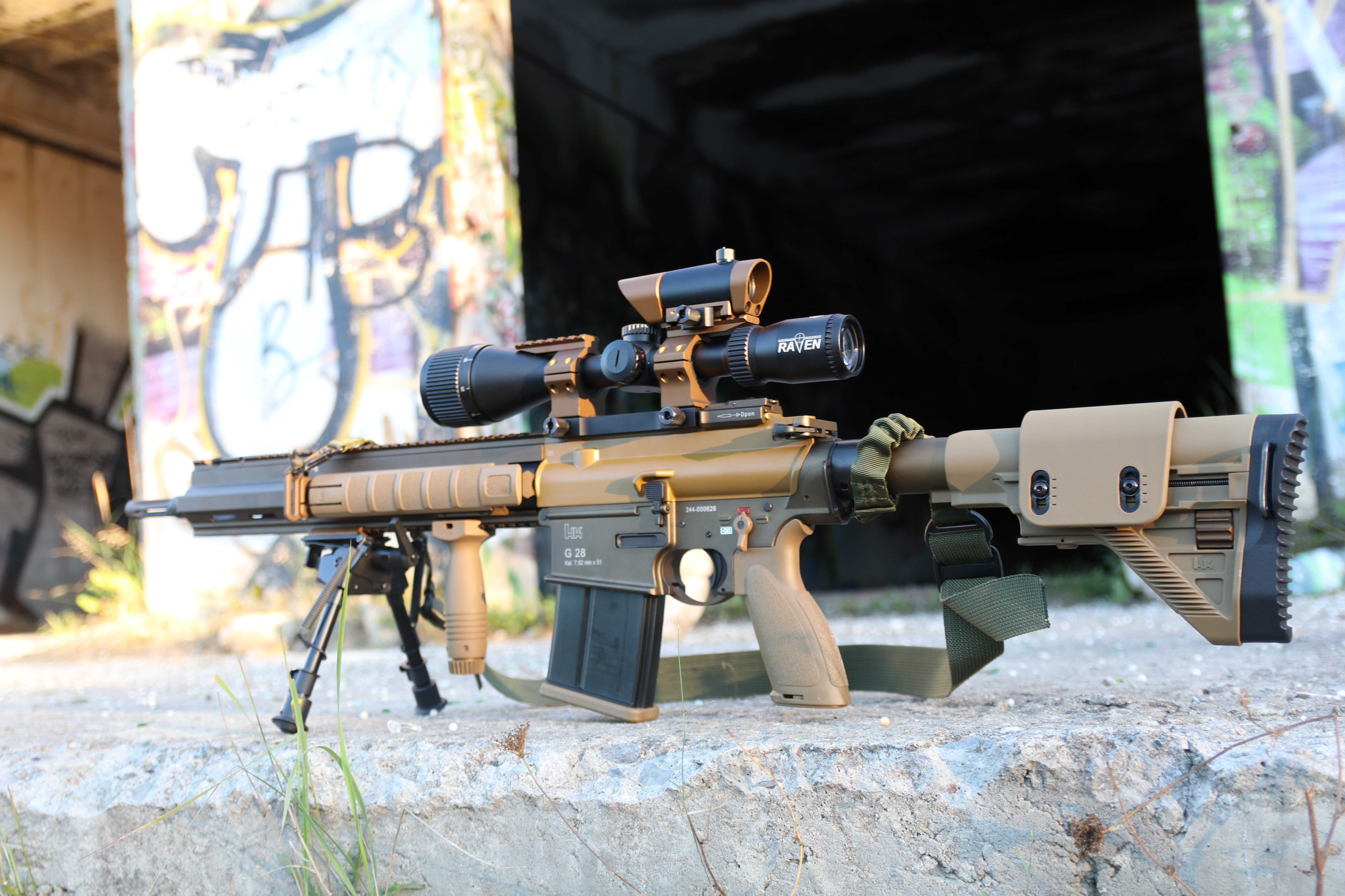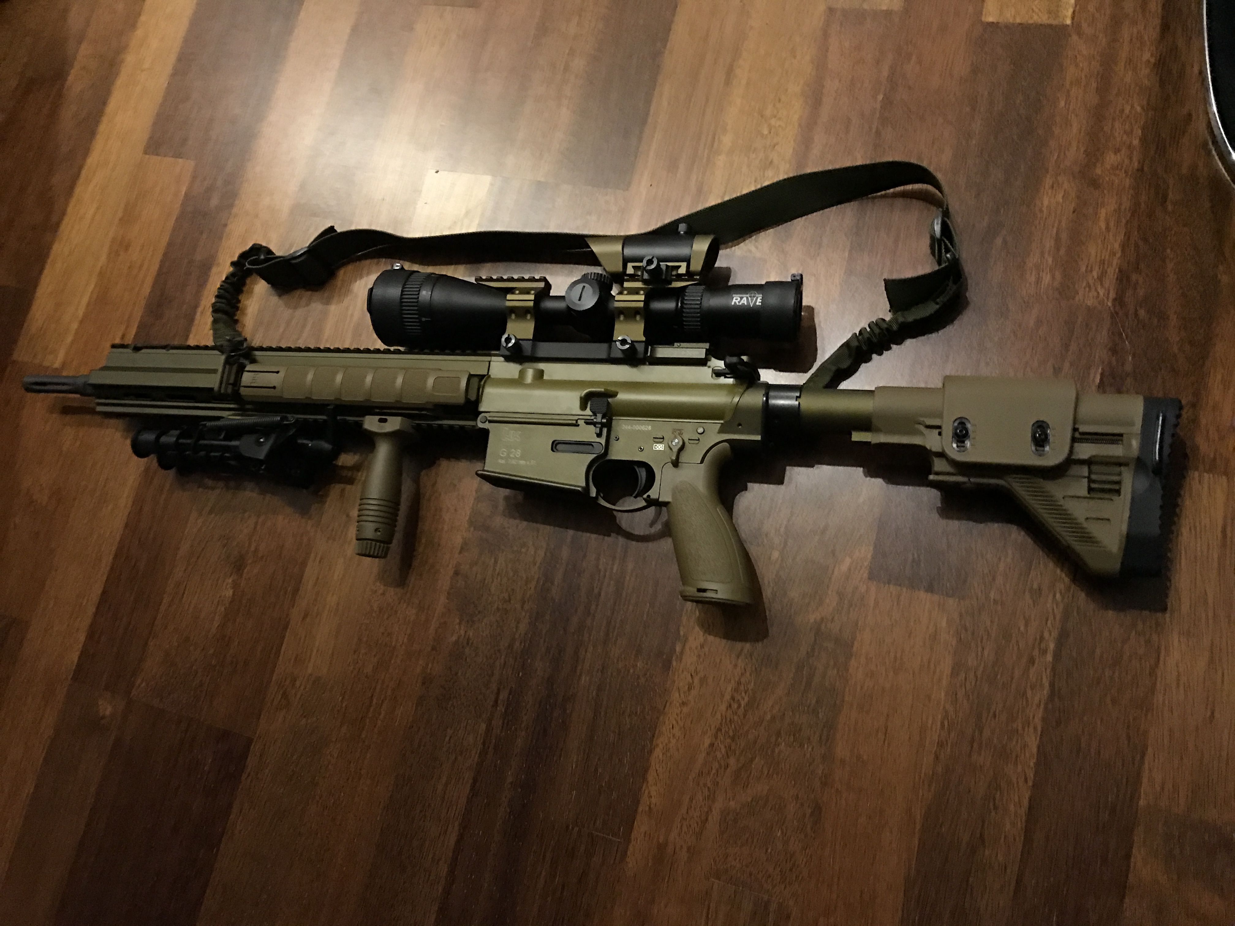 A pak samozřejmě zbraň. Jedná se o limitovanou edici (300 kusů na světě) plynové Heckler & Koch G28 od VFC, se třemi zásobníky. Uvnitř je hlaveň Maple Leaf spolu s gumičkou Maple leaf. Dále byla měněna tryska za trysku verze 2, která je výkonově nastavitelná. Aktuálně střílím 145 m/s s 0.4 kuličkama, tedy cca 4 joule. Zbraň teď jak je, tedy vše seřízeno a už si to na sebe zvyklo střílí absolutně přesně, trefoval jsem s tím postavy na více než 100m. K pušce je samozřejmě originální příslušenství (v tomto případě ho H&K dává přímo z ostré verze, a to dvojnožka, rukojeť a montážní základna optiky a kolimátoru). Optika je Raven 4-16x50 (vypadá nejvíce jako optika u ostré) a kolimátor aimpoint T1 ( výrobce nějaký německý, asi jediný sedí do montáže kromě originálu). Zbraň má vystříleno cca 600 kuliček.