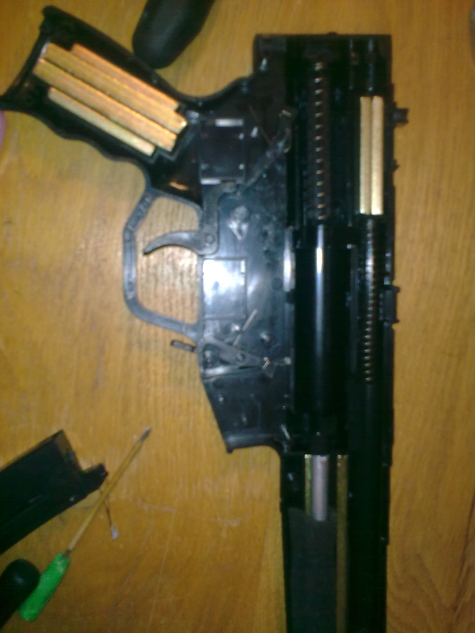 Upgrade: Velmi doporučuji zbraň rozebrat, to provedete tak, že zbraň položíme na stůl, aby její hlaveň mířila napravo od nás. Potom odšroubujeme mušku a pažbu a odšroubujeme 2 šroubky v rukojeti. Pak stačí odšroubovat tři šroubky a zbraň opatrně rozcvaknout. Když se tam něco uvolní, nezoufejte, fotka jak to má být je přiložena. Potom ze zbraně vytáhneme hlaveň a podložíme hop-up. Když budeme s podložením hopu spokojeni, podložíme tak o centimetr pružinu(přidávám pouze foto v základu-při upgradování jsem nefotil). Pružinu nejlépe podložíme tak, že tu tyčinku vzadu zbraně, na které je pružina na konci omotáme elektrikářskou páskou a potom ji seřízneme na míru. Pružina jde vyměnit(standartní m80) za m 130, ale to už je moc prasoupgrade. Když pružinu podložíte moc, nepůjde zbraň nabít. Potom zbraň sešroubujeme definitivně, musíme ji secvaknout, i když zbraň protestuje a vydává divné zvuky, stačí na to jen přitlačit, ale zase ne tak, aby jste ji zlomili. Další nutný začátečnický upgrade je následující: Dole na zásobníku je taková jako když plastový šroubek. Buď ho můžete šikovně zakápnout sekunďákem(ale fakt opatrně, ať neslepíte zásobník), nebo přelepit páskou. Tento „šroubek“ drží pružiny zásobníku, a není příjemné, když se zásobník v boji(v lese) rozstřelí a musíte hledat pružinky. Tento upgrade VELMI doporučuji, i když s MP5 budete střílet jinak v základu. Neprovedením tohoto upgradu riskujete ztrátu zásobníku. Velmi doporučuji další zásobník, protože když hrajete delší dobu, nebo proti lidem, co se dost kryjí, tak je i těch 42 ran málo. Zásobníky jdou buď slepit a vypadá to víc HUA, a nebo nosit třeba v kapse nebo sumce. Nevýhoda slepených zásobníků je ta, že jestli se plazíte nebo někde ležíte, tak zaručeně budete rýt tím druhým zásobníkem do země, a znečistíte první kuli, která následně zašpiní HOP-UP. Další upgrade(jak pro koho) je odmontování kolíku(je to taková pružinka a kolík, ale jde to zase přidělat) , co drží pažbu ve zbrani tak, aby nešla vytáhnout,když je mezi dvěma polohami-zasunuto, vysunuto. Pažbu jde zafixovat zasunutou nebo vysunutou. Jinak jde vytáhnout. Výhoda tohoto upgradu je, že máte MP5 s pažbou, která jde nosit buď zasunutá, nebo vysunutá. Hlavně ale jde oddělat.Kdykoliv, kdekoliv, snadno odděláte a přiděláte. Oddělání pažby používám v případě CQB a hlavně při boji na metr. Ta MP5 je totiž tak „dobře“ navrhnutá, že pro člověka , co má větší ruce není držení zbraně se zasunutou pažbou moc pohodlné, téměř nemožné. Bez pažby ale není možné střílet efektivně a přesně rychlopalbu(natahuju a mačkám rychle spoušť, mířím podle toho, kam dopadají kuličky), ale zase nemusíte vystrkovat celou ruku a v budově, nebo v malém prostoru se s ní lépe manévruje. S pažbou je to zase lepší na delší vzdálenosti. To pak se zbraní jde střílet podle dopadajících kuliček a hlavně se nemusí tolik mířit. Jakmile se naučíte mířit celou zbraní, máte vyhráno. Samozřejmě, že s pažbou se zvedne i přesnost rychlopalby. Nejlepší je našroubovat si tam sklopnou pažbu z MP5 PDW nebo MP5A5, k čemu se časem dopracuji.