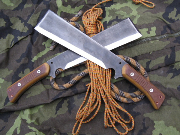 to tomcat: Blackovo Bolo rozhodně respect Trochu to tu oživím, před nějaku dobou jsem se zamiloval do nože , který se už nevyrábí a jeho cena se na ebay pohybuje okolo 700 dolarů......jedná se o naprosto ultimátní bojový pracovní nůž Battle Mistress vyrobený společností Busse. Originál je z legendární ocele INFI patentované zmíněnu společností, délka je 40,5cm a síla čepele u některých modelů až 0,32 palcem, tedy 8,128mm!!!! pár fotek http://www.bladeforums.com/forums/showt ... e-Mistress http://rathy.rajce.idnes.cz/Busse/Kvůli astronomické ceně a nedostupnosti jsem se rozhodnul, že si ho nějak vykouzlím, za co nejméně peněz. Dal jsem se teda do shánění a na serveru knife.cz jsem sehnal výkres v autocadu....samotného nože i střenek Potom jsme se dal do shánění ocele, požadavek byl jasnej, tlouštka minimálně 7mm, minimální náročnost na opracovnání a kalení a maximální nezničitelnost za co nejmíň peněz....rozhodl jsem se tedy pro jednoduchou a spolehlivou pružinovou ocel. Po spoustě mailech s prodejcema ocelí a údivu nad mnou požadovanou tloušťkou jsem nakonec napsal do pružinárny v Plzni, kde se jim válel plát 150x500x8 a za 5 dní byl doma 5kg vážící plochej balíček za pár stovek  Následovalo řezání, díky rozměrům plátu se nože vešli v klidu dva  , takže plát s výkresem putovaly na vodní řezačku někde u HK.....výsledky jsem dostal k vánocům V současný době se mi doma válí jeden polotovar, druhej je na broušení a kalení u nožíře. O víkendu jsem připravil střenky....už netrpělivě čekám, až dorazí, hotová čepel od nožíře Střenky jsou od začátku do konce home made. Materiál je tzv mikarta, což je vrstvená a pomocí epoxydu slepená a lisovaná látka. Vrstvil jsem černou a tmavě zelenou, uvidíme co po broušení vyleže za strukturu. Je to takovej laminát, tlouk jsem do zbytků kladivem a všeljak je lámal, bežnou sílou je to skoro nezničitelný!!!! Na fotkách jsou polotovary po řezání vodou, porovnání velikosti s nožema co nosím(RD-7 do lesa, ESEE-4 mám POŘÁD u sebe), šablony na střenky řezaný z nerezu laserem a výroba střenek.